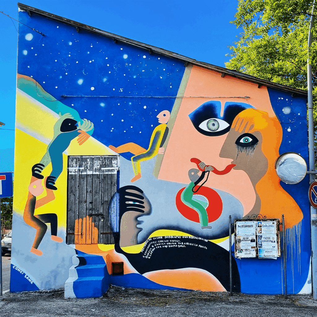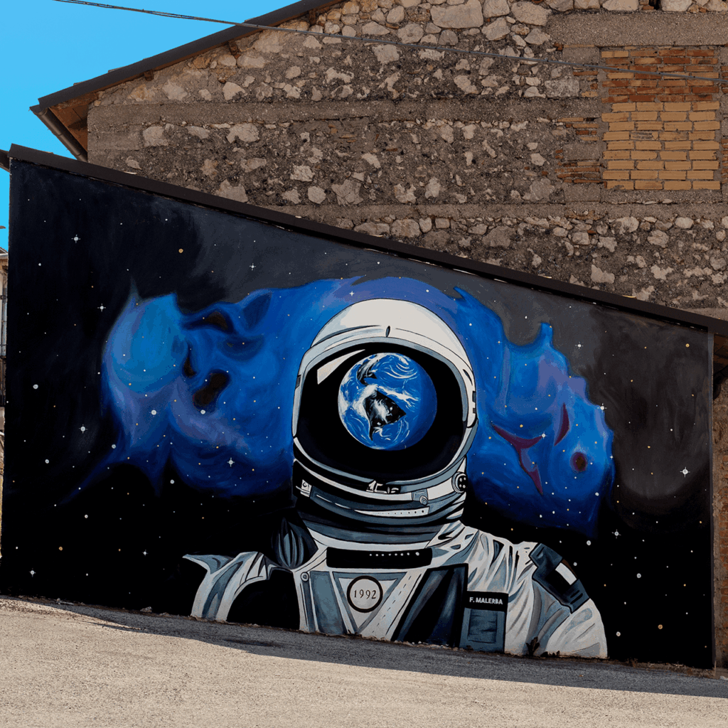 Correva l’anno 2017 quando le associazioni di Aielli iniziano a collaborare tra loro e con l’amministrazione comunale per introdurre una novità: la Street Art. Prende vita così la prima edizione di Borgo Universo, festival di arte urbana che ancora una volta vede coinvolto il tessuto sociale aiellese, storicamente proattivo e coeso, in questa nuova attività popolare. Murale dopo murale, Aielli inizia quasi in maniera innata un processo di riqualificazione e rigenerazione in termini di storia, cultura ed economia. Borgo Universo ha reso il piccolo paese una meta turistica nel quale sono nate nuove attività, si è generata una fitta rete di B&B e strutture e ricettive, gli enti già presenti sul territorio si sono modernizzati e attrezzati per offrire servizi all’avanguardia. La particolarità della Street Art di Borgo Universo sta in quello che i murales raccontano: parlano della storia e delle origini degli aiellesi, rifacendosi continuamente al tema dell’astronomia, filo conduttore di quello che diventerà nel corso degli anni un vero e proprio Museo a Cielo Aperto. La scelta dell’astronomia come tema principale è stata quasi naturale e bisogna attribuirne i meriti a Filippo Angelitti (Aielli, 1856 – Palermo 1931): astronomo rinomato che ha avuto all’epoca la possibilità di dedicarsi allo studio dell’universo e che ha inevitabilmente guidato gli aiellesi a sviluppare questo fascinoso interesse per l’astronomia. Il binomio astronomia – storia delle proprie origini non solo si rivela funzionale, ma permette di non dimenticare quello che è successo in passato in termini di riscatto, denuncia sociale e tradizioni che si mantengono vive stimolando anche la novità: è, forse, proprio la tradizione popolare che fa di Aielli un paese vivo con una comunità unita, come se fosse una grande famiglia.